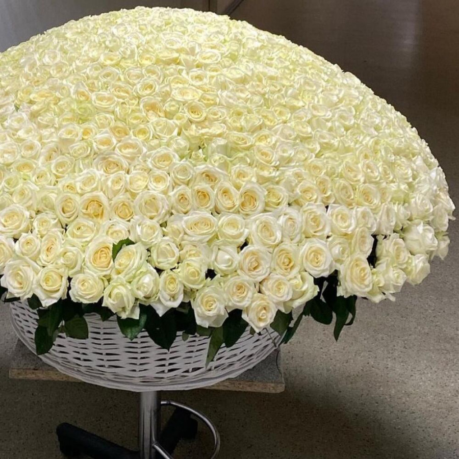На фото 1001 белая роза в корзине «чистота». В составе: роза 1001 шт, корзина (xl) 1 шт, оазис флористический 27 шт, . Все цветы свежие и ароматные, букет красиво оформлен и отлично подходит для подарка. Доступна доставка цветов или самовывоз.