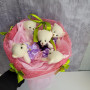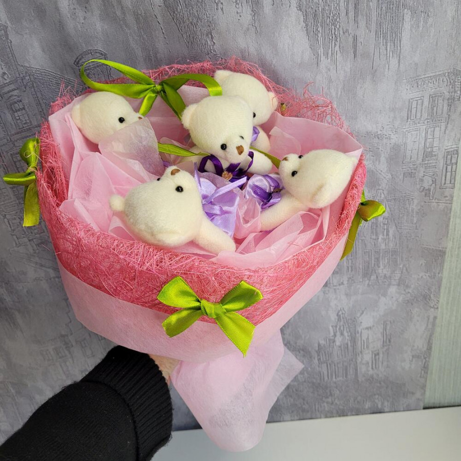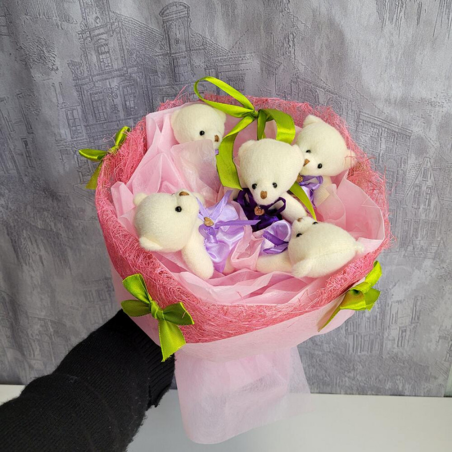 На фото букет из игрушек мишки 5 шт. В составе: . Все цветы свежие и ароматные, букет красиво оформлен и отлично подходит для подарка. Доступна доставка цветов или самовывоз.
