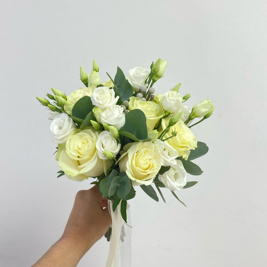 На фото свадебный букет из белых эустом и роз. В составе: эустома (лизиантус) 3 шт, роза 7 шт, бруния 2 шт, эвкалипт 1 шт, атласная лента 2 шт, . Все цветы свежие и ароматные, букет красиво оформлен и отлично подходит для подарка. Доступна доставка цветов или самовывоз.